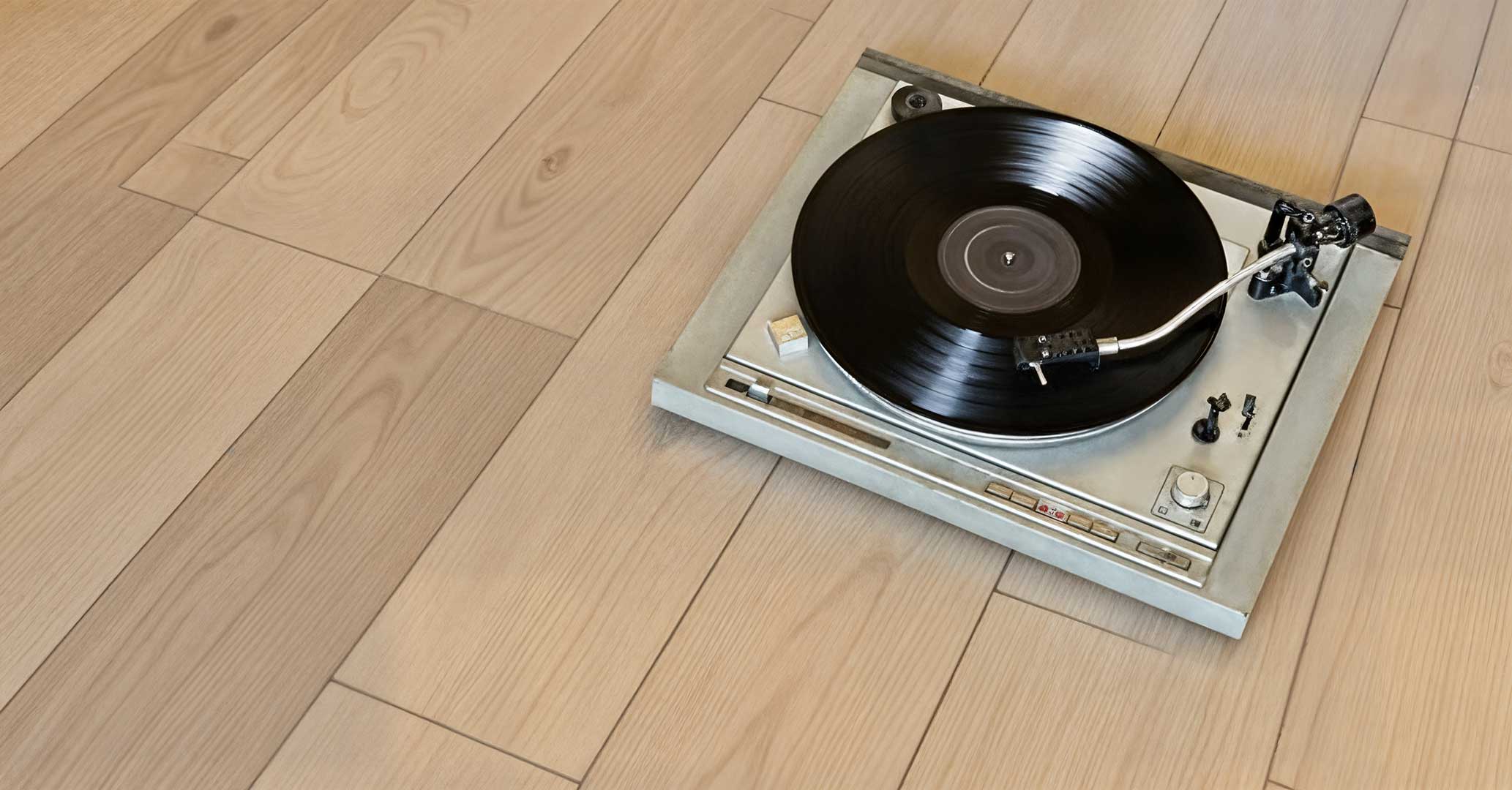 Platenspeler staat op luxe vinyl tegelvloer in moderne woonkamer