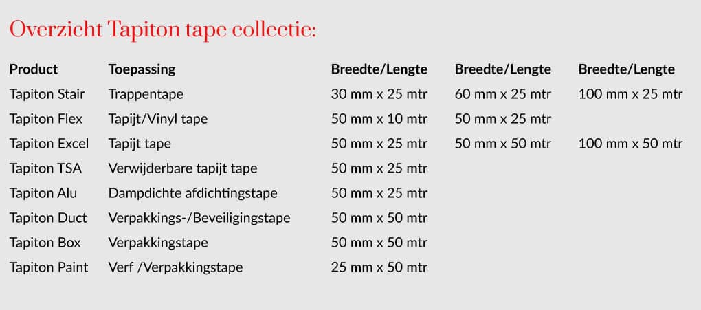 • Pour une utilisation sur les escaliers, il faut un ruban spécifique : Tapiton Stair. Hautement résistant aux plastifiants, il est parfait pour le PVC (y compris les nez de marche et plinthes) ainsi que les sols en vinyle. Il ne sèche pas et ne devient pas cassant. Disponible en trois largeurs : 30, 60 et 100 mm.